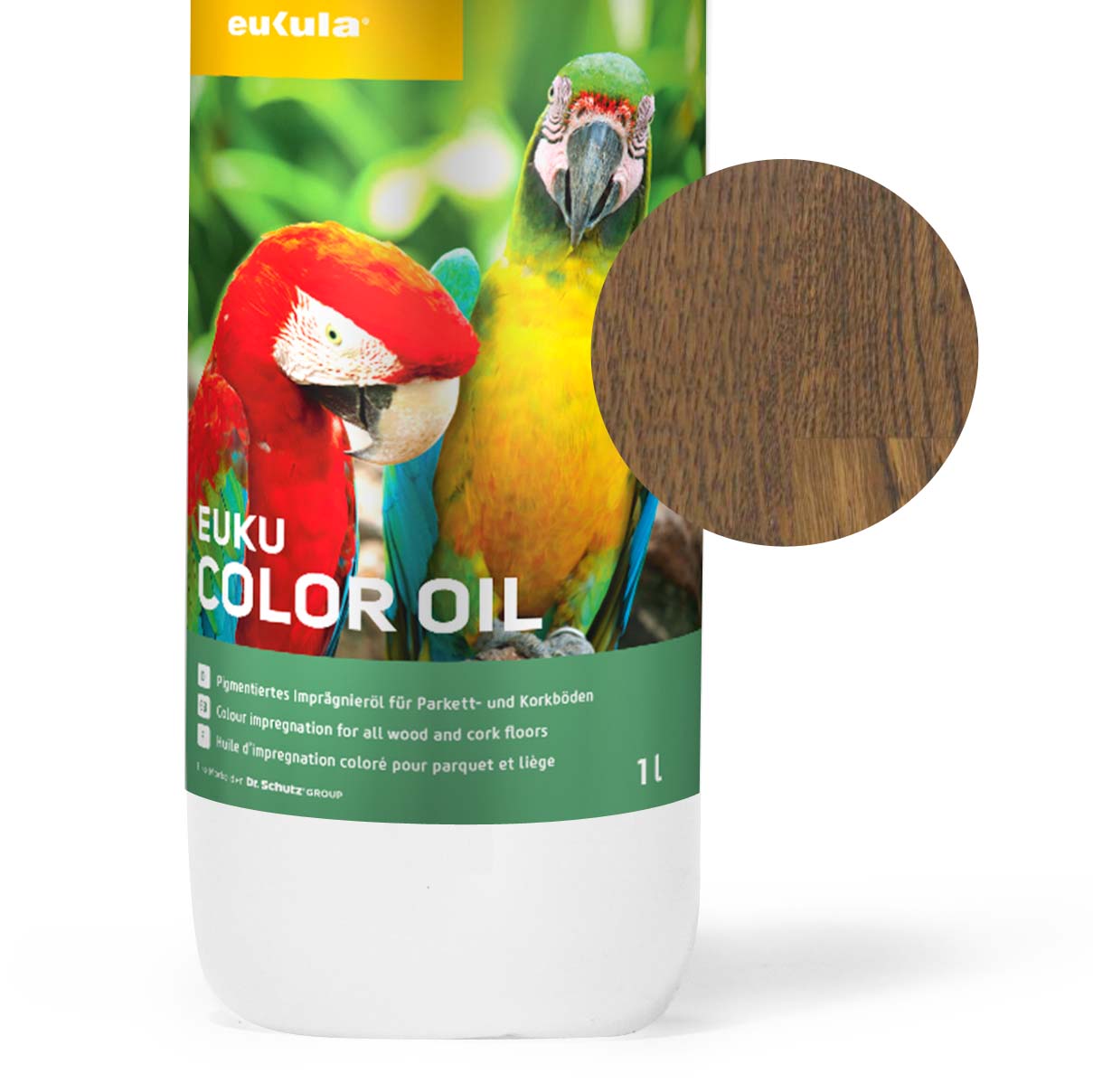 Euku Coloröle haben einen Festkörperanteil von 100%, sind lösemittel- und kobaltfrei. Das Euku Color Oil FS ist eine naturölbasierte, (hier: kaffeefarben) pigmentierte Tiefenimprägnierung für abgeschliffene Holz-, Kork- und Parkettböden im Innenbereich. Es ist für Fußbodenheizungen geeignet und nicht schichtbildend. Das Holz behält seinen offenporigen Charakter. Das Öl kann mit dem optionalen Zusatz Euku Master FS (auf Anfrage erhältlich) versetzt werden, um Trocknung und Beständigkeit über das schon sehr gute Maß hinaus noch weiter zu verbessern.