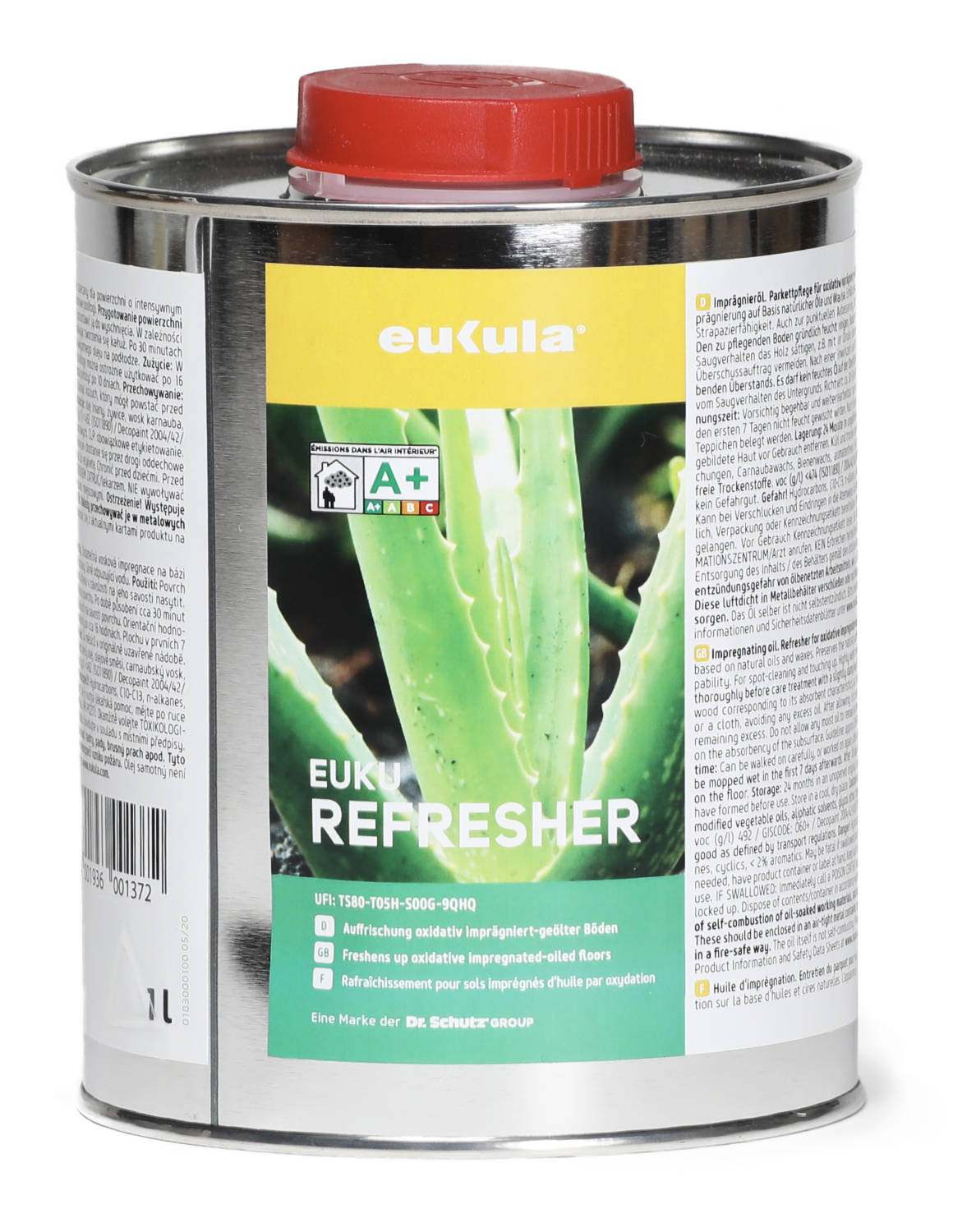Der eukula Refresher Classic (ehemals Euku Refresher classic) ist das ideale Pflegeprodukt für die Auffrischung und Tiefenimprägnierung ausgelaugter Holz-, Kork- und Parkettfußböden im Wohn- wie auch im Objektbereich. Aufgrund seiner angenehm dünnflüssigen Einstellung ist er darüber hinaus auch für Möbel, Paneele und dergleichen zu verwenden. Frischt stumpfe und besonders beanspruchte bzw. intensivgereinigte Öloberflächen wieder auf. Das Produkt überzeugt durch ein hohes Eindringvermögen und sehr hohe Füllkraft. Das seidenmatte Finish optimiert die Strapazierfähigkeit. Reichweite ca. 50-100 m² Inhaltsstoffe Natürliche Öle und Wachse, modifizierte Pflanzenöle (wie Leinöl, Saffloröl, Hanföl), modifizierte Pflanzenöle, Carnaubawachs, aliphatische Kohlenwasserstoffe, Glycolether, blei- und kobaltfreie Trockenstoffe. Verarbeitung Der aufzufrischende Boden gründlich feucht reinigen und anschließend trocknen lassen. Tragen Sie den Euku Refresher classic mit einem Lappen, Pinsel oder einer Rolle auf den Boden auf. Nach einer Einwirkzeit von etwa 15 - 30 Minuten können Sie den verbleibenden Refresher, mit einer Einscheibenmaschine und weißem Pad, auspolieren. Während der Verarbeitung darf das Öl nicht auf dem Boden antrocknen und nach dem Auspolieren darf kein Öl mehr auf der Oberfläche verbleiben. Der Boden ist weiterbearbeitbar und vorsichtig begehbar nach ca. 6-12 Stunden. Die behandelte Fläche sollte in den ersten 3 Tagen nach dem Auftrag nicht feucht gewischt werden. Nach frühestens 10-14 Tagen kann der Boden mit Teppichen belegt werden. Wichtig: Es darf kein feuchtes Öl auf der Oberfläche stehen bleiben!Nicht empfohlen für beschichtete Oberflächen ohne Anfeuerung, zum Beispiel Beschichtungen mit wasserbasierten Ölen und sonstigen Wasserlacken.Bitte beachten Sie auch immer das Technische Merkblatt! Tipp: zum Auspolieren größerer Flächen empfehlen wir den Floorboy mit weißen Pads. Farbton und Abtönbarkeit Der Euku Refresher classic ist für besonders strapazierte bzw. intensivgereinigte, natur oder dunkel geölte Holzböden geeignet. Verbrauch Der Verbrauch des Refreshers liegt bei da. 10-20 ml/m². Bei stark saugenden oder profilierten Untergründen kann der Verbrauch höher liegen. Werkzeuge, Werkzeugreiniger & Zubehör Der Auftrag gelingt am Besten mit einem Fellwischer wie dem T-Wischer. Für das Auspolieren empfehlen wir den Floorboy mit weißen Pads. Sicherheitshinweise Warnhinweis! Selbstentzündungsgefahr von ölbenetzten Arbeitsmitteln, wie z. B. Tücher, Vliese, Schleifstaub u.ä.. Diese luftdicht in Metallbehälter verschließen oder mit Wasser tränken und brandsicher entsorgen. Das Öl selber ist nicht selbstentzündlich.