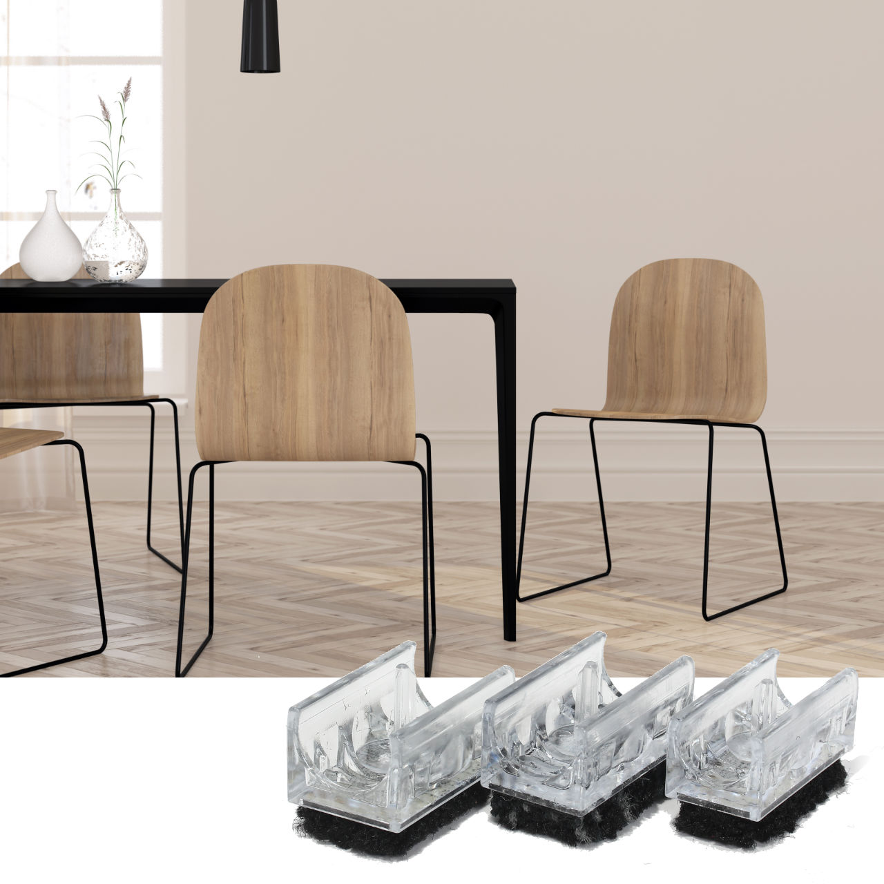 Die dezent transparenten scratchnomore Chairfixx Schutzelemente für Schwingstühle bieten optimalen Schutz auch für klassische Schwingstühle mit größerer Auflagefläche. Sie werden einfach um das aufliegende Stuhlsegment herum festgeklickt, wobei der stabile Pin in vorhandene Bohrungen eingepasst wird und so für zusätzliche Stabilität sorgt.
